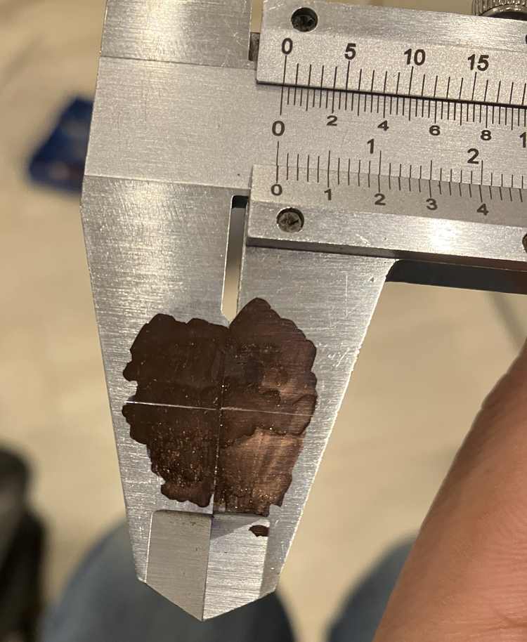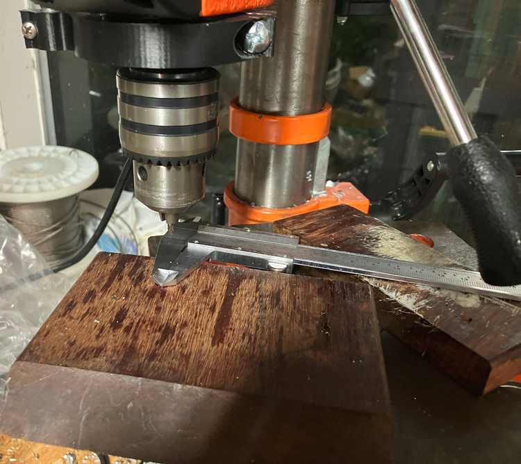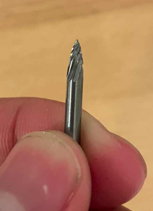 I next decided to use a pointed carbide burr made for rotary tools. The burr was put in a drill press set to its maximum speed of 3100 RPM. Using pieces of wood, I supported the calipers on the table, and drilled a divot on the scribed line, about 1/16″ from the edge of the solid jaw.