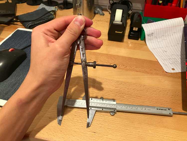Unfortunately, not many vernier calipers today retain this feature, since the manual lay-out (i.e. scribing the locations of features on a part to serve as a guide for machining) that dividers and trammels are used for has become practically obsolete after the introduction digital readouts on machine tools. However, for the hobbyist who does not have access such machines, using traditional layout techniques is a good option for getting comparable precision. Sometimes a ruler and a marker just isn’t good enough. To put this feature on my pair of calipers, I put two small divots on the outside measurement jaws, perfectly in line with each other, 1/8″ apart.
