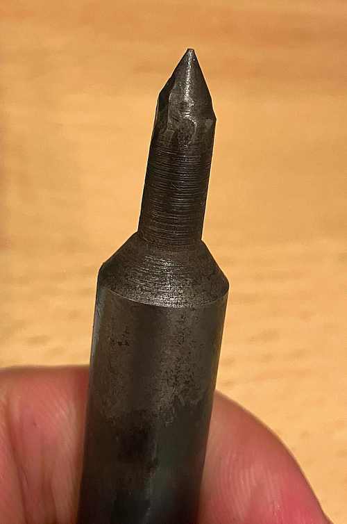 To actually put the divots in the caliper jaws, I first tried to make my own prick punch. I’d previously been gifted a bag of broken tools from my school’s machine shop, so I took a carbide-tipped boring bar with a 1/2″ shank, cut the tip off, and ground a sharp point (~60°) on it. Based on the appearance of the sparks, I think it was a medium-carbon steel of some sort, with a carbon content somewhere between a file, and a piece of structural steel. To heat-treat it, I heated the tip red-hot with a propane burner, then quenched it in water. When I ran a file over the tip, it skated off, indicated that it was quite hard. I decided not to temper the punch, seeing as it was (probably) medium-carbon and I wanted it to be as hard as possible. Unfortunately, the prick punch made no impression at all on the calipers, which were probably some hardened martensitic stainless steel.