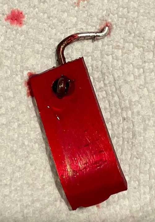 The negative electrode in the anodization cell is termed the “cathode”, and must be made of something which will not injure the solution — either an inert metal like stainless steel or titanium, or aluminium. An aluminium cathode is protected from corrosion during anodization through cathodic protection, but will slowly dissolve whenever a current is not running. Online guides specifically warn against a copper cathode, though when I tried one (made from a loop of copper wire) for anodizing small parts, it worked all right. Possibly the stronger anodizing solutions used in industry will dissolve a copper cathode, adding copper ions to the solution which may negatively affect the anodization.