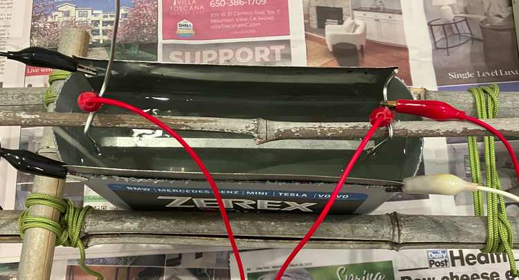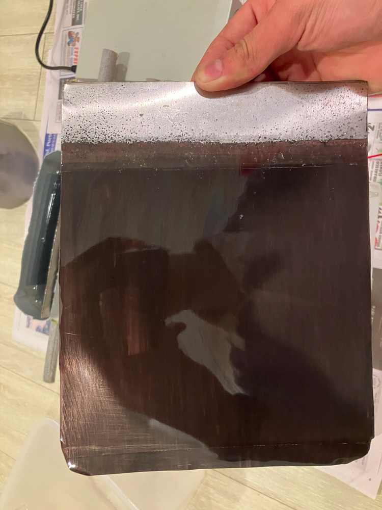 I used a pair of 316 stainless-steel sheets cut from a broken refrigerator’s door. They developed a black powdery coating during anodization — most likely some reduced metal or precipitated ionic compound. This coating also fizzed in the anodizing solution after current was turned off.