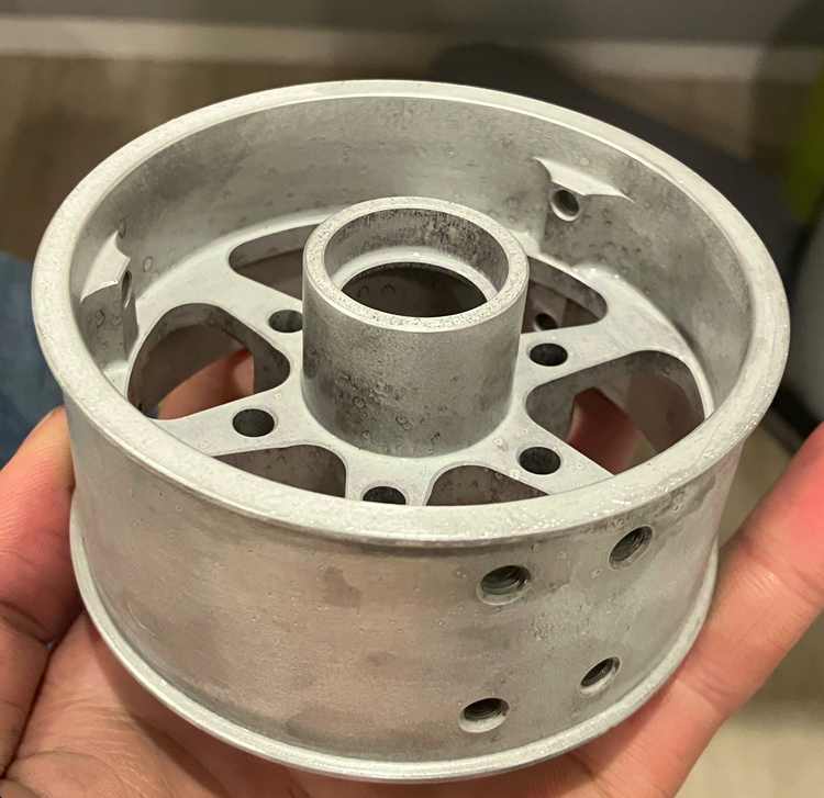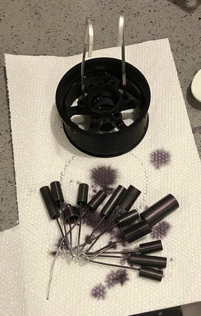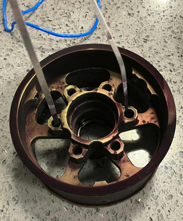 Most online guides say that parts must be excruciatingly clean before anodization, and recommend some combination of sanding, degreasing, etching with sodium hydroxide, and de-smutting to remove the residue from etching. I had success simply scrubbing all parts thoroughly with dish soap and stainless-steel wool. However, I did notice some fingerprint-marks on dyed parts, so be careful when handling parts before and after anodizing.
