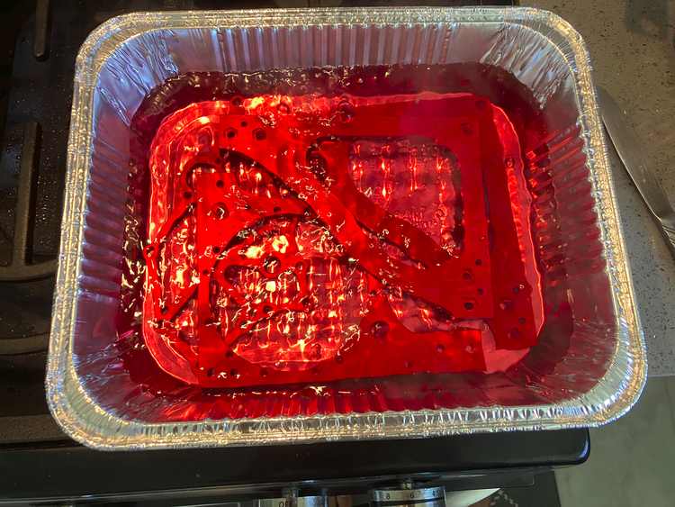 To re-anodize the part, I first dissolved the failed coating in sodium hydroxide drain cleaner. I tried about a 3:1 dilution for about 20 minutes, which had very vigorous gas production, and dissolved some small pits into the aluminium’s surface. After scrubbing the part and further diluting the solution to about 20:1, I etched the part about 30 minutes longer, which was able to get most of the oxide off. I also found a Dremel wire-wheel and a piece of Scotch-Brite helpful in removing stubborn bits of coating.