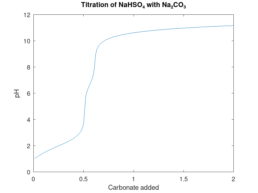 The chemistry is more complicated than this simplified explanation suggests, especially since carbonate is a diprotic and weak base. To calculate the titration curve, I wrote a Matlab program to solve the simultaneous equilibrium equations governing ion concentrations and pH. It works by forming a system of polynomial equations to solve for the amount that each reaction must go forward or backward to reach equilibrium, then “throwing out” the non-linear terms, and solving the system. This is more efficient than using the built-in polynomial solver, and avoids the extraneous solutions that have negative concentrations. The linear approximation is fairly good if the starting conditions are already close to equilibrium, but if the solution obtained is not precise enough (if q is not close enough to keq), the simulation runs another iteration to converge closer to the true solution.