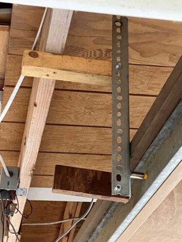 UPDATE 2025-09-17: The garage door hasn’t been closing so consistently, so I’ve modified the sensor mounting. The piece of angle-iron is now held loosely by a single screw so that it can swing freely, and I’ve attached a counterweight so that it swings towards the garage door. That should keep the inductive sensor very close, or in contact with, the garage door.