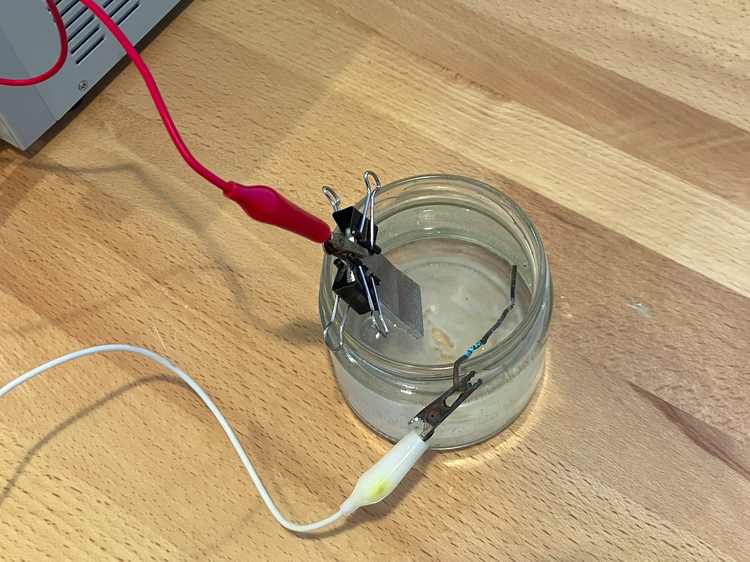 A challenge in this case is finding an anode material which resists oxidation. Probably the safest and most convenient option is graphite obtained from pencil “lead”, though it will still degrade slowly. If the wax (added to make a smoother writing experience) is burned off by gentle heating, it will slowly swell and crack, eventually breaking off; If the wax is not burned off, the lead will slowly flake away. I imagine this is due to the acid reacting with the clay in the lead, not the graphite, which is generally unreactive. A more durable anode is lead, though small flakes still came off of it, due to the brittle lead dioxide formed on the surface flaking away from the softer metal.