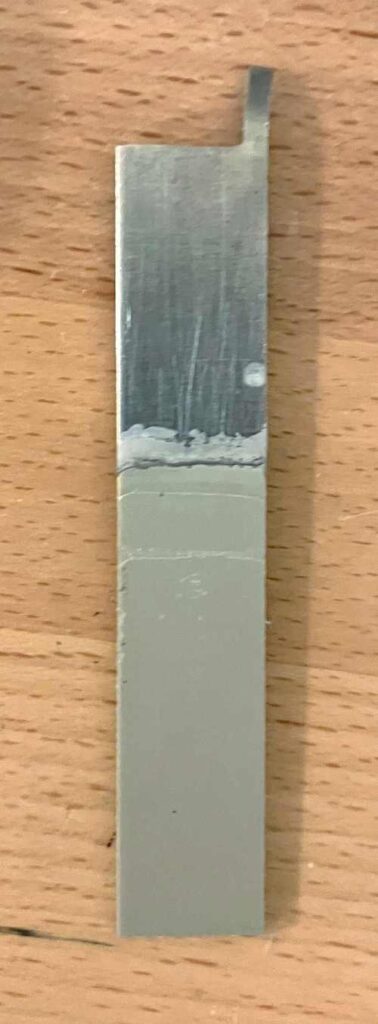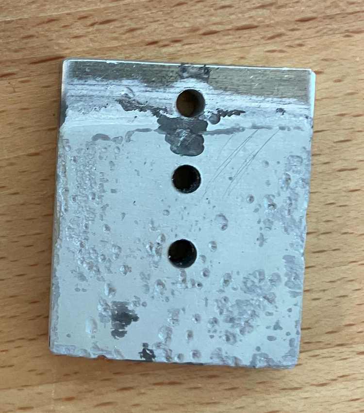 Parts coming out of the salt and Epsom salt solutions had their surfaces dissolved (“etched”) away, making a surface finish very similar to anodized parts. The way I found to test between them was to scratch parts with any hard, sharp steel object — I used the tip of some tweezers. With unanodized surfaces it obviously “dug” into the surface with a noticeable dragging, whereas it easily skated off anodized ones.