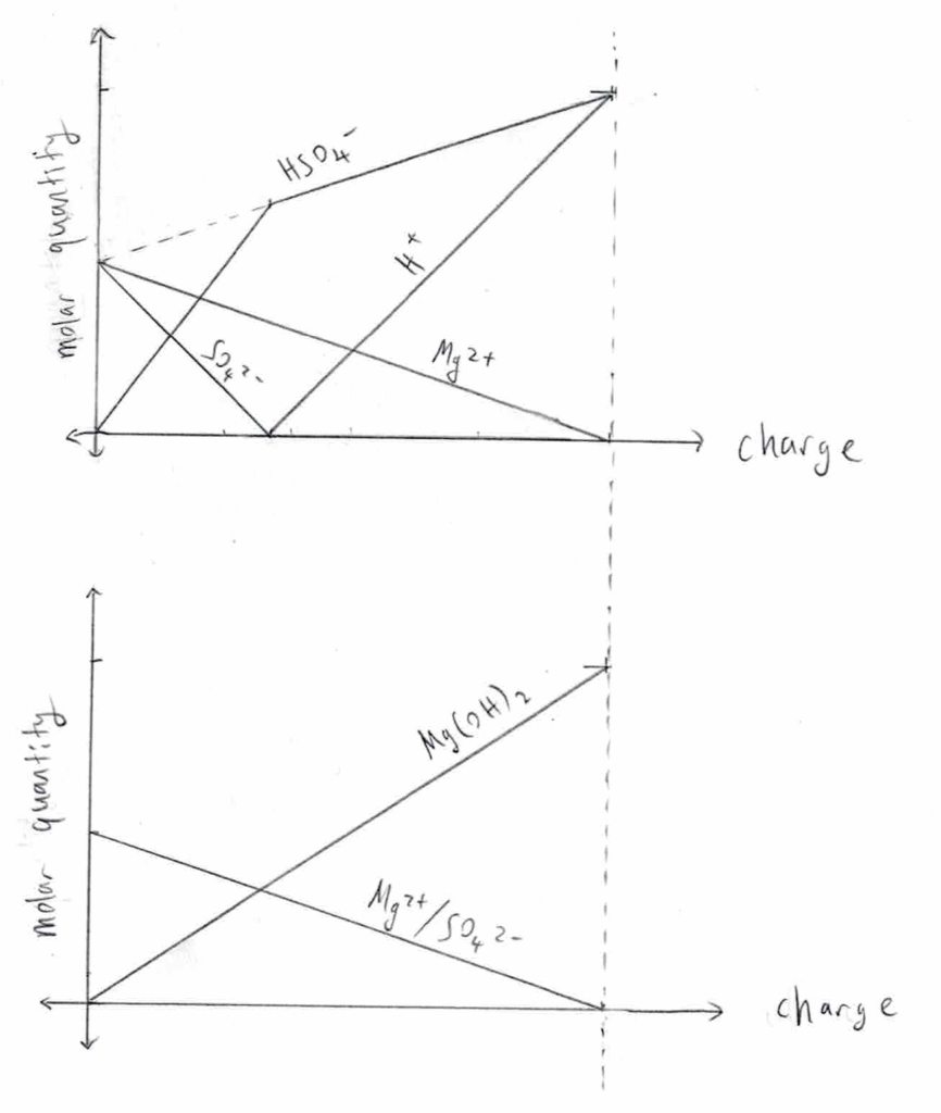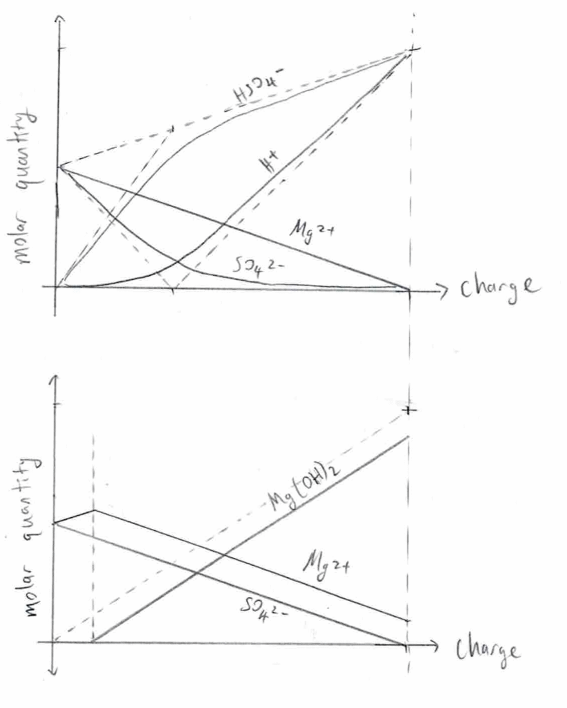 My guess for how the ion concentrations change over time is depicted in the following graphs. The one on the left assumes infinitely-small dissociation constants for MgOH2 and HSO4–, whereas the one on the right does not. Both graphs neglect the movement of H+ and OH– through the salt bridge.
